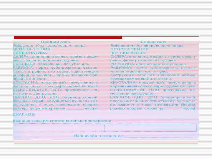 Подозрение на глаукому o Жалобы: дискомфорт, затуманивание зрения o ВГД асимметрия более 5 мм ри. ст. o Скотомы в центральном п/зр, зоне Бьеррума o ДЗН: расширение Э >0, 5, асимметрия Э, кровоизлияния o БМС и МГС: атрофия стромы и пигментной каймы, их асимметрия, ПЭ, клювовидный или узкий УПК, гониосинехии, интенсивная пигментация трабекул