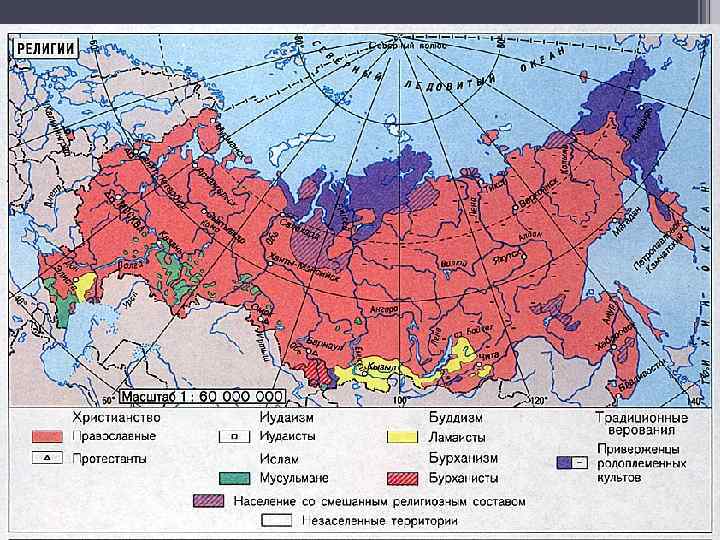 Религии в России По данным всероссийского опроса, проведённого ВЦИОМ в марте 2010 года, население страны причисляет себя к следующим конфессиям: • Православие — 75 % • Ислам — 5 % • Католицизм, протестантизм, • иудаизм, буддизм - по 1 % • Другие конфессии — около 1 % • Неверующие — 8 %