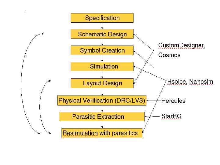 Разработка библиотечных элементов • Полностью заказная схема • Создание электрической схемы • Характеризация • Создание топологии • Экстракция паразитных составляющих • Окончательная характеризация