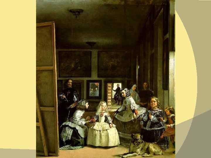 Веласкес (1599– 1660 гг. ) Гений Веласкеса представлен в Прадо 50 -ю творениями, среди которых центральное место занимает всемирный шедевр «Менины» , созданный в 1656 г. Реалистичная картина, изображающая сцену из жизни семьи короля Филиппа IV, мгновенно переносит созерцателя на несколько веков назад и делает его участником действия. В центре композиции – пятилетняя инфанта Маргарита, которая вместе со своей свитой находится в мастерской, где придворный художник Диего Веласкес пишет портрет ее родителей. Филипп IV и его жена Марианна Австрийская, одновременно приходящаяся ему племянницей, позируют за пределами полотна и отображаются в висящем на стене зеркале. Они внимательно смотрят на дочь, всеми силами стремящуюся продемонстрировать родителям свое умение держать себя по-королевски. Художник отчетливо передает контраст между хрупкой прелестью, живостью личика принцессы и той непростой ролью, которую она вынуждена играть соответственно высокому сану, лишившему ее детства. Свита инфанты, включающая фрейлин, гвардадамаса, дуэнью и карликов, выписана весьма достоверно, что говорит о желании живописца подчеркнуть особенности придворного этикета.