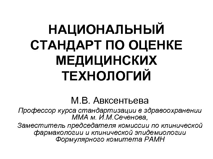 НАЦИОНАЛЬНЫЙ СТАНДАРТ ПО ОЦЕНКЕ МЕДИЦИНСКИХ ТЕХНОЛОГИЙ М. В. Авксентьева Профессор курса стандартизации в здравоохранении ММА м. И. М. Сеченова, Заместитель председателя комиссии по клинической фармакологии и клинической эпидемиологии Формулярного комитета РАМН