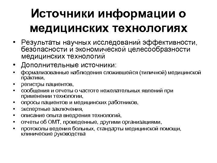 Источники информации о медицинских технологиях • Результаты научных исследований эффективности, безопасности и экономической целесообразности медицинских технологий • Дополнительные источники: • • формализованные наблюдения сложившейся (типичной) медицинской практики, регистры пациентов, сообщения и отчеты о частоте нежелательных явлений применении технологии, опросы пациентов и медицинских работников, экспертные заключения, описание опыта внедрения технологий, отчеты об ОМТ, проведенные, другими организациями, протоколы ведения больных, стандарты медицинской помощи, клинические руководства