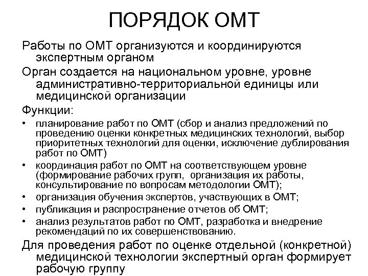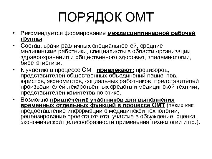 ПОРЯДОК ОМТ • Рекомендуется формирование междисциплинарной рабочей группы, • Состав: врачи различных специальностей, средние медицинские работники, специалисты в области организации здравоохранения и общественного здоровья, эпидемиологии, биостатистики. • К участию в процессе ОМТ привлекают: провизоров, представителей общественных объединений пациентов, юристов, экономистов, социальных работников, представителей производителей лекарственных средств и медицинской техники, представителей комитетов по этике. • Возможно привлечение участников для выполнения временных отдельных функций в процессе ОМТ (таких как предоставление информации о медицинской технологии, рецензирование проекта отчета, участие в обсуждение, оценка экономической целесообразности применения технологии и пр. ).