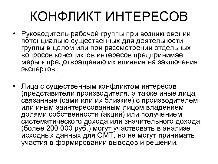 КОНФЛИКТ ИНТЕРЕСОВ • Руководитель рабочей группы при возникновении потенциально существенных для деятельности группы в целом или при рассмотрении отдельных вопросов конфликтов интересов предпринимает меры к предотвращению их влияния на заключения экспертов. • Лица с существенным конфликтом интересов (представители производителя, а также иные лица, связанные (сами или их близкие) с производителем или иным заинтересованным лицом владением долями собственности (акций) или получением систематического дохода или значительного дохода (более 200 000 руб. ) могут участвовать в анализе исходных данных для ОМТ, но не могут принимать участия в формировании выводов и решений.