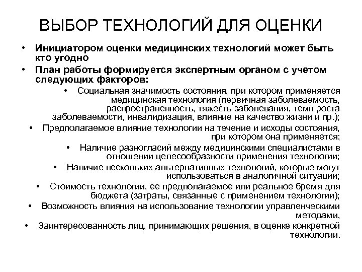 ВЫБОР ТЕХНОЛОГИЙ ДЛЯ ОЦЕНКИ • Инициатором оценки медицинских технологий может быть кто угодно • План работы формируется экспертным органом с учетом следующих факторов: • Социальная значимость состояния, при котором применяется медицинская технология (первичная заболеваемость, распространенность, тяжесть заболевания, темп роста заболеваемости, инвалидизация, влияние на качество жизни и пр. ); • Предполагаемое влияние технологии на течение и исходы состояния, при котором она применяется; • Наличие разногласий между медицинскими специалистами в отношении целесообразности применения технологии; • Наличие нескольких альтернативных технологий, которые могут использоваться в аналогичной ситуации; • Стоимость технологии, ее предполагаемое или реальное бремя для бюджета (затраты, связанные с применением технологии); • Возможность влияния на использование технологии управленческими методами, • Заинтересованность лиц, принимающих решения, в оценке конкретной технологии.