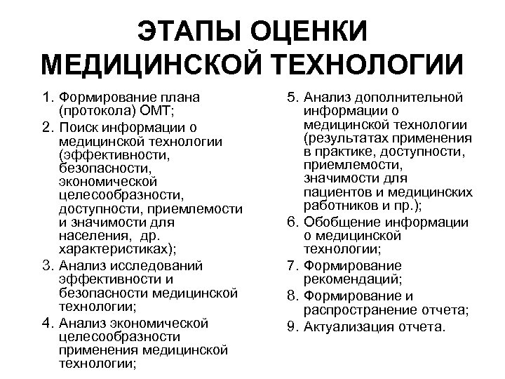 ЭТАПЫ ОЦЕНКИ МЕДИЦИНСКОЙ ТЕХНОЛОГИИ 1. Формирование плана (протокола) ОМТ; 2. Поиск информации о медицинской технологии (эффективности, безопасности, экономической целесообразности, доступности, приемлемости и значимости для населения, др. характеристиках); 3. Анализ исследований эффективности и безопасности медицинской технологии; 4. Анализ экономической целесообразности применения медицинской технологии; 5. Анализ дополнительной информации о медицинской технологии (результатах применения в практике, доступности, приемлемости, значимости для пациентов и медицинских работников и пр. ); 6. Обобщение информации о медицинской технологии; 7. Формирование рекомендаций; 8. Формирование и распространение отчета; 9. Актуализация отчета.