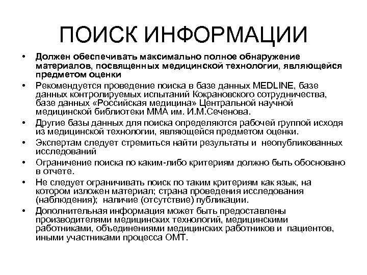 ПОИСК ИНФОРМАЦИИ • • Должен обеспечивать максимально полное обнаружение материалов, посвященных медицинской технологии, являющейся предметом оценки Рекомендуется проведение поиска в базе данных MEDLINE, базе данных контролируемых испытаний Кокрановского сотрудничества, базе данных «Российская медицина» Центральной научной медицинской библиотеки ММА им. И. М. Сеченова. Другие базы данных для поиска определяются рабочей группой исходя из медицинской технологии, являющейся предметом оценки. Экспертам следует стремиться найти результаты и неопубликованных исследований Ограничение поиска по каким-либо критериям должно быть обосновано в отчете. Не следует ограничивать поиск по таким критериям как язык, на котором изложен материал; страна проведения исследования (наблюдения); наличие (отсутствие) публикации. Дополнительная информация может быть предоставлены производителями медицинских технологий, медицинскими работниками, объединениями медицинских работников и пациентов, иными участниками процесса ОМТ.