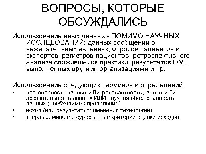ВОПРОСЫ, КОТОРЫЕ ОБСУЖДАЛИСЬ Использование иных данных - ПОМИМО НАУЧНЫХ ИССЛЕДОВАНИЙ: данных сообщений о нежелательных явлениях, опросов пациентов и экспертов, регистров пациентов, ретроспективного анализа сложившейся практики, результатов ОМТ, выполненных другими организациями и пр. Использование следующих терминов и определений: • • • достоверность данных ИЛИ релевантность данных ИЛИ доказательность данных ИЛИ научная обоснованность данных (необходимо определение) исход (или результат) применения технологии) твердые, мягкие и суррогатные критерии оценки исходов;