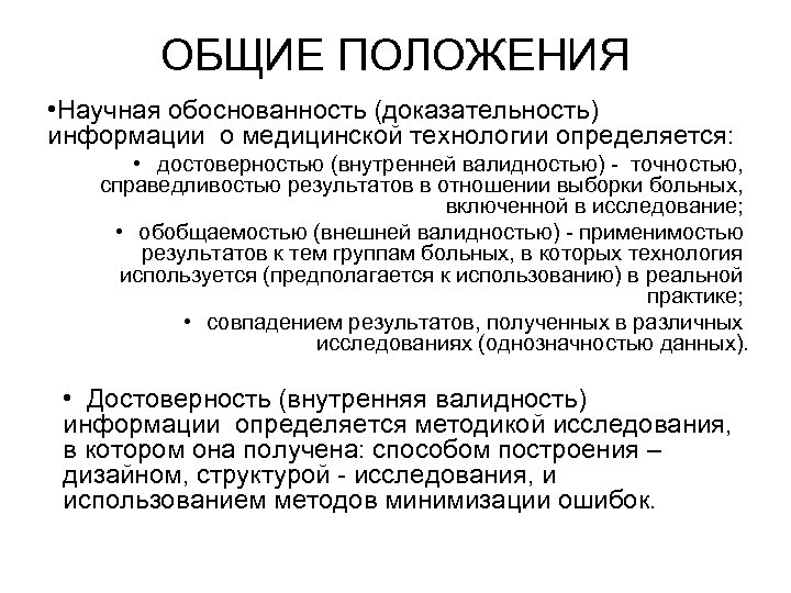 ОБЩИЕ ПОЛОЖЕНИЯ • Научная обоснованность (доказательность) информации о медицинской технологии определяется: • достоверностью (внутренней валидностью) - точностью, справедливостью результатов в отношении выборки больных, включенной в исследование; • обобщаемостью (внешней валидностью) - применимостью результатов к тем группам больных, в которых технология используется (предполагается к использованию) в реальной практике; • совпадением результатов, полученных в различных исследованиях (однозначностью данных). • Достоверность (внутренняя валидность) информации определяется методикой исследования, в котором она получена: способом построения – дизайном, структурой - исследования, и использованием методов минимизации ошибок.