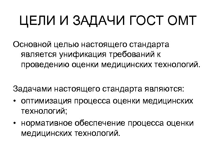 ЦЕЛИ И ЗАДАЧИ ГОСТ ОМТ Основной целью настоящего стандарта является унификация требований к проведению оценки медицинских технологий. Задачами настоящего стандарта являются: • оптимизация процесса оценки медицинских технологий; • нормативное обеспечение процесса оценки медицинских технологий.