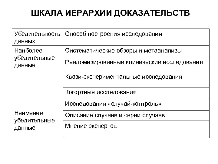 ШКАЛА ИЕРАРХИИ ДОКАЗАТЕЛЬСТВ Убедительность Способ построения исследования данных Наиболее убедительные данные Систематические обзоры и метаанализы Рандомизированные клинические исследования Квази-экспериментальные исследования Когортные исследования Исследования «случай-контроль» Наименее убедительные данные Описание случаев и серии случаев Мнение экспертов