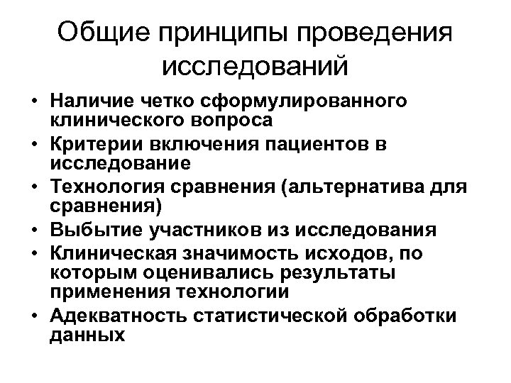 Общие принципы проведения исследований • Наличие четко сформулированного клинического вопроса • Критерии включения пациентов в исследование • Технология сравнения (альтернатива для сравнения) • Выбытие участников из исследования • Клиническая значимость исходов, по которым оценивались результаты применения технологии • Адекватность статистической обработки данных
