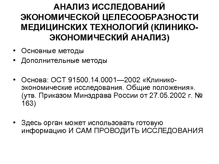 АНАЛИЗ ИССЛЕДОВАНИЙ ЭКОНОМИЧЕСКОЙ ЦЕЛЕСООБРАЗНОСТИ МЕДИЦИНСКИХ ТЕХНОЛОГИЙ (КЛИНИКОЭКОНОМИЧЕСКИЙ АНАЛИЗ) • Основные методы • Дополнительные методы • Основа: ОСТ 91500. 14. 0001— 2002 «Клиникоэкономические исследования. Общие положения» . (утв. Приказом Минздрава России от 27. 05. 2002 г. № 163) • Здесь орган может использовать готовую информацию И САМ ПРОВОДИТЬ ИССЛЕДОВАНИЯ