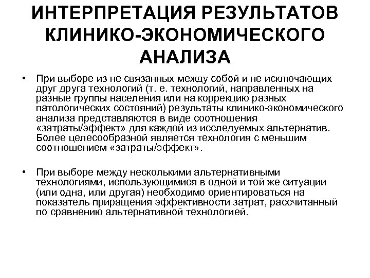 ИНТЕРПРЕТАЦИЯ РЕЗУЛЬТАТОВ КЛИНИКО-ЭКОНОМИЧЕСКОГО АНАЛИЗА • При выборе из не связанных между собой и не исключающих друга технологий (т. е. технологий, направленных на разные группы населения или на коррекцию разных патологических состояний) результаты клинико-экономического анализа представляются в виде соотношения «затраты/эффект» для каждой из исследуемых альтернатив. Более целесообразной является технология с меньшим соотношением «затраты/эффект» . • При выборе между несколькими альтернативными технологиями, использующимися в одной и той же ситуации (или одна, или другая) необходимо ориентироваться на показатель приращения эффективности затрат, рассчитанный по сравнению альтернативной технологией.