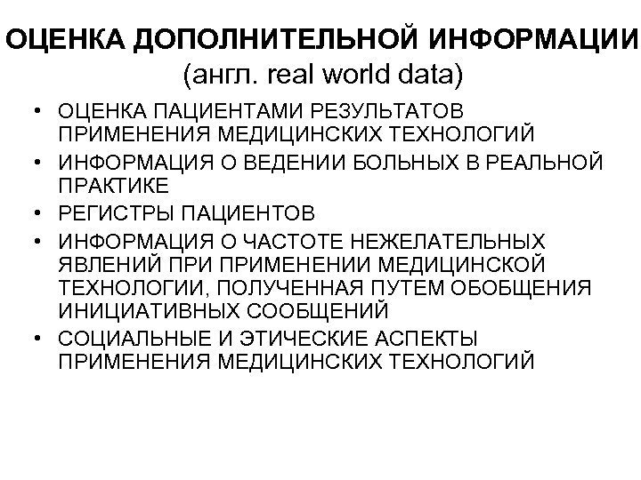 ОЦЕНКА ДОПОЛНИТЕЛЬНОЙ ИНФОРМАЦИИ (англ. real world data) • ОЦЕНКА ПАЦИЕНТАМИ РЕЗУЛЬТАТОВ ПРИМЕНЕНИЯ МЕДИЦИНСКИХ ТЕХНОЛОГИЙ • ИНФОРМАЦИЯ О ВЕДЕНИИ БОЛЬНЫХ В РЕАЛЬНОЙ ПРАКТИКЕ • РЕГИСТРЫ ПАЦИЕНТОВ • ИНФОРМАЦИЯ О ЧАСТОТЕ НЕЖЕЛАТЕЛЬНЫХ ЯВЛЕНИЙ ПРИМЕНЕНИИ МЕДИЦИНСКОЙ ТЕХНОЛОГИИ, ПОЛУЧЕННАЯ ПУТЕМ ОБОБЩЕНИЯ ИНИЦИАТИВНЫХ СООБЩЕНИЙ • СОЦИАЛЬНЫЕ И ЭТИЧЕСКИЕ АСПЕКТЫ ПРИМЕНЕНИЯ МЕДИЦИНСКИХ ТЕХНОЛОГИЙ