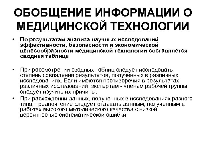 ОБОБЩЕНИЕ ИНФОРМАЦИИ О МЕДИЦИНСКОЙ ТЕХНОЛОГИИ • По результатам анализа научных исследований эффективности, безопасности и экономической целесообразности медицинской технологии составляется сводная таблица • При рассмотрении сводных таблиц следует исследовать степень совпадения результатов, полученных в различных исследованиях. Если имеются противоречия в результатах различных исследований, экспертам - членам рабочей группы следует изучить их причины. • При расхождении данных, полученных в исследованиях разного типа, предпочтение следует отдавать данным, полученным в работах высокого методического качества с низкой вероятностью систематической ошибки.