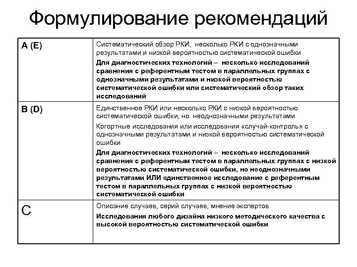 Формулирование рекомендаций А (E) Систематический обзор РКИ, несколько РКИ с однозначными результатами и низкой вероятностью систематической ошибки Для диагностических технологий – несколько исследований сравнения с референтным тестом в параллельных группах с однозначными результатами и низкой вероятностью систематической ошибки или систематический обзор таких исследований В (D) Единственное РКИ или несколько РКИ с низкой вероятностью систематической ошибки, но неоднозначными результатами Когортные исследования или исследования «случай-контроль» с однозначными результатами и низкой вероятностью систематической ошибки Для диагностических технологий – несколько исследований сравнения с референтным тестом в параллельных группах с низкой вероятностью систематической ошибки, но неоднозначными результатами ИЛИ единственное исследование с референтным тестом в параллельных группах с низкой вероятностью систематической ошибки С Описание случаев, серий случаев; мнение экспертов Исследования любого дизайна низкого методического качества с высокой вероятностью систематической ошибки
