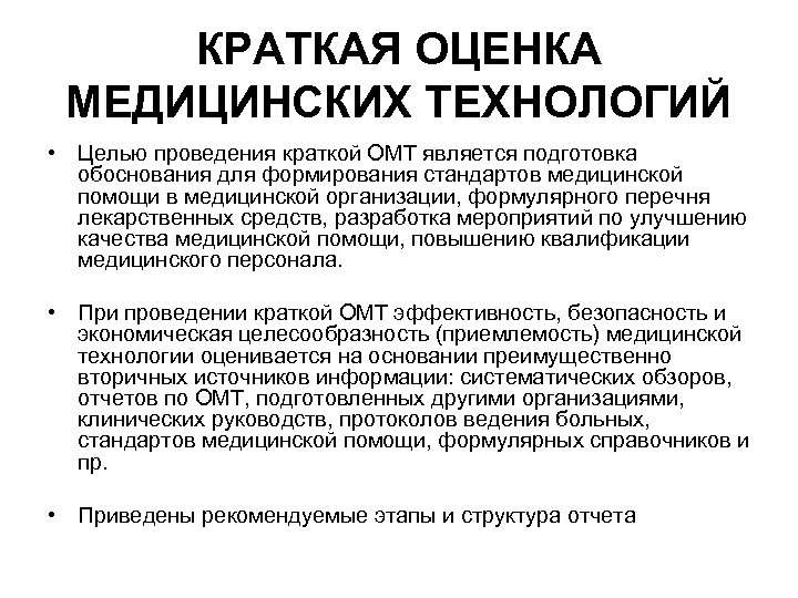 КРАТКАЯ ОЦЕНКА МЕДИЦИНСКИХ ТЕХНОЛОГИЙ • Целью проведения краткой ОМТ является подготовка обоснования для формирования стандартов медицинской помощи в медицинской организации, формулярного перечня лекарственных средств, разработка мероприятий по улучшению качества медицинской помощи, повышению квалификации медицинского персонала. • При проведении краткой ОМТ эффективность, безопасность и экономическая целесообразность (приемлемость) медицинской технологии оценивается на основании преимущественно вторичных источников информации: систематических обзоров, отчетов по ОМТ, подготовленных другими организациями, клинических руководств, протоколов ведения больных, стандартов медицинской помощи, формулярных справочников и пр. • Приведены рекомендуемые этапы и структура отчета