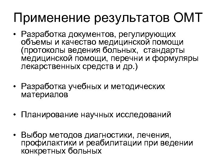 Применение результатов ОМТ • Разработка документов, регулирующих объемы и качество медицинской помощи (протоколы ведения больных, стандарты медицинской помощи, перечни и формуляры лекарственных средств и др. ) • Разработка учебных и методических материалов • Планирование научных исследований • Выбор методов диагностики, лечения, профилактики и реабилитации при ведении конкретных больных