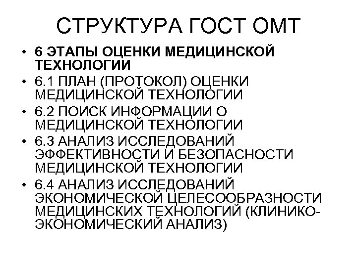 СТРУКТУРА ГОСТ ОМТ • 6 ЭТАПЫ ОЦЕНКИ МЕДИЦИНСКОЙ ТЕХНОЛОГИИ • 6. 1 ПЛАН (ПРОТОКОЛ) ОЦЕНКИ МЕДИЦИНСКОЙ ТЕХНОЛОГИИ • 6. 2 ПОИСК ИНФОРМАЦИИ О МЕДИЦИНСКОЙ ТЕХНОЛОГИИ • 6. 3 АНАЛИЗ ИССЛЕДОВАНИЙ ЭФФЕКТИВНОСТИ И БЕЗОПАСНОСТИ МЕДИЦИНСКОЙ ТЕХНОЛОГИИ • 6. 4 АНАЛИЗ ИССЛЕДОВАНИЙ ЭКОНОМИЧЕСКОЙ ЦЕЛЕСООБРАЗНОСТИ МЕДИЦИНСКИХ ТЕХНОЛОГИЙ (КЛИНИКОЭКОНОМИЧЕСКИЙ АНАЛИЗ)