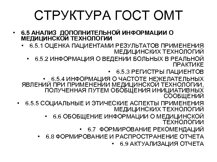 СТРУКТУРА ГОСТ ОМТ • 6. 5 АНАЛИЗ ДОПОЛНИТЕЛЬНОЙ ИНФОРМАЦИИ О МЕДИЦИНСКОЙ ТЕХНОЛОГИИ • 6. 5. 1 ОЦЕНКА ПАЦИЕНТАМИ РЕЗУЛЬТАТОВ ПРИМЕНЕНИЯ МЕДИЦИНСКИХ ТЕХНОЛОГИЙ • 6. 5. 2 ИНФОРМАЦИЯ О ВЕДЕНИИ БОЛЬНЫХ В РЕАЛЬНОЙ ПРАКТИКЕ • 6. 5. 3 РЕГИСТРЫ ПАЦИЕНТОВ • 6. 5. 4 ИНФОРМАЦИЯ О ЧАСТОТЕ НЕЖЕЛАТЕЛЬНЫХ ЯВЛЕНИЙ ПРИМЕНЕНИИ МЕДИЦИНСКОЙ ТЕХНОЛОГИИ, ПОЛУЧЕННАЯ ПУТЕМ ОБОБЩЕНИЯ ИНИЦИАТИВНЫХ СООБЩЕНИЙ • 6. 5. 5 СОЦИАЛЬНЫЕ И ЭТИЧЕСКИЕ АСПЕКТЫ ПРИМЕНЕНИЯ МЕДИЦИНСКИХ ТЕХНОЛОГИЙ • 6. 6 ОБОБЩЕНИЕ ИНФОРМАЦИИ О МЕДИЦИНСКОЙ ТЕХНОЛОГИИ • 6. 7 ФОРМИРОВАНИЕ РЕКОМЕНДАЦИЙ • 6. 8 ФОРМИРОВАНИЕ И РАСПРОСТРАНЕНИЕ ОТЧЕТА • 6. 9 АКТУАЛИЗАЦИЯ ОТЧЕТА