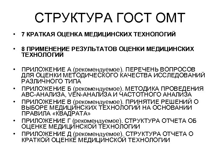 СТРУКТУРА ГОСТ ОМТ • 7 КРАТКАЯ ОЦЕНКА МЕДИЦИНСКИХ ТЕХНОЛОГИЙ • 8 ПРИМЕНЕНИЕ РЕЗУЛЬТАТОВ ОЦЕНКИ МЕДИЦИНСКИХ ТЕХНОЛОГИЙ • ПРИЛОЖЕНИЕ А (рекомендуемое). ПЕРЕЧЕНЬ ВОПРОСОВ ДЛЯ ОЦЕНКИ МЕТОДИЧЕСКОГО КАЧЕСТВА ИССЛЕДОВАНИЙ РАЗЛИЧНОГО ТИПА • ПРИЛОЖЕНИЕ Б (рекомендуемое). МЕТОДИКА ПРОВЕДЕНИЯ АВС-АНАЛИЗА, VEN-АНАЛИЗА И ЧАСТОТНОГО АНАЛИЗА • ПРИЛОЖЕНИЕ В (рекомендуемое). ПРИНЯТИЕ РЕШЕНИЙ О ВЫБОРЕ МЕДИЦИНСКИХ ТЕХНОЛОГИЙ НА ОСНОВАНИИ ПРАВИЛА «КВАДРАТА» • ПРИЛОЖЕНИЕ Г (рекомендуемое). СТРУКТУРА ОТЧЕТА ОБ ОЦЕНКЕ МЕДИЦИНСКОЙ ТЕХНОЛОГИИ • ПРИЛОЖЕНИЕ Д (рекомендуемое). СТРУКТУРА ОТЧЕТА О КРАТКОЙ ОЦЕНКЕ МЕДИЦИНСКОЙ ТЕХНОЛОГИИ