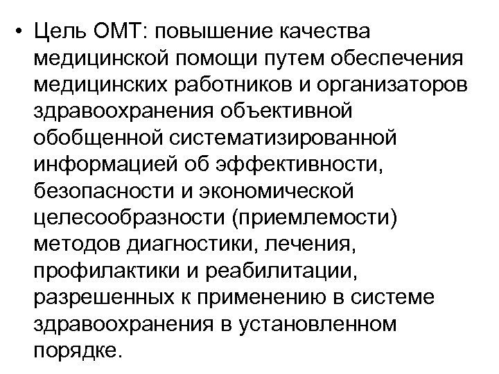 • Цель ОМТ: повышение качества медицинской помощи путем обеспечения медицинских работников и организаторов здравоохранения объективной обобщенной систематизированной информацией об эффективности, безопасности и экономической целесообразности (приемлемости) методов диагностики, лечения, профилактики и реабилитации, разрешенных к применению в системе здравоохранения в установленном порядке.