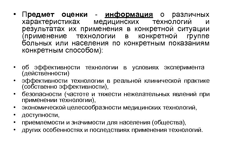 • Предмет оценки - информация о различных характеристиках медицинских технологий и результатах их применения в конкретной ситуации (применение технологии в конкретной группе больных или населения по конкретным показаниям конкретным способом): • об эффективности технологии в условиях эксперимента (действенности) • эффективности технологии в реальной клинической практике (собственно эффективности), • безопасности (частоте и тяжести нежелательных явлений применении технологии), • экономической целесообразности медицинских технологий, • доступности, • приемлемости и значимости для населения (общества), • других особенностях и последствиях применения технологий.