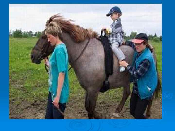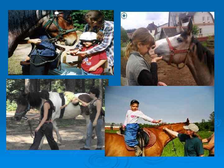 Ø Ø Предлагаемая программа разработана специально для детей, страдающих церебральным параличом, и имеет строгую дозировку нагрузки, поэтапность проведения и комплексный подход. Наибольший эффект иппотерапия оказывает на стабилизацию положения головы (эффективность в 80% случаев), навыка стойки на коленях ( прогресс практически у 100% больных), манипуляцию верхними конечностями (эффект у 60% испытуемых детей). У всех пациентов наблюдается позитивное влияние после занятий с лошадьми на психоэмоциональное состояние, улучшение общего состояния интереса к общению. Дети становятся более позитивно настроены, открыты, уменьшается спастика мышц, менее выраженными становятся контрактуры. Улучшается координация, менее численными—непроизвольные движения, улучшается моторная функция.