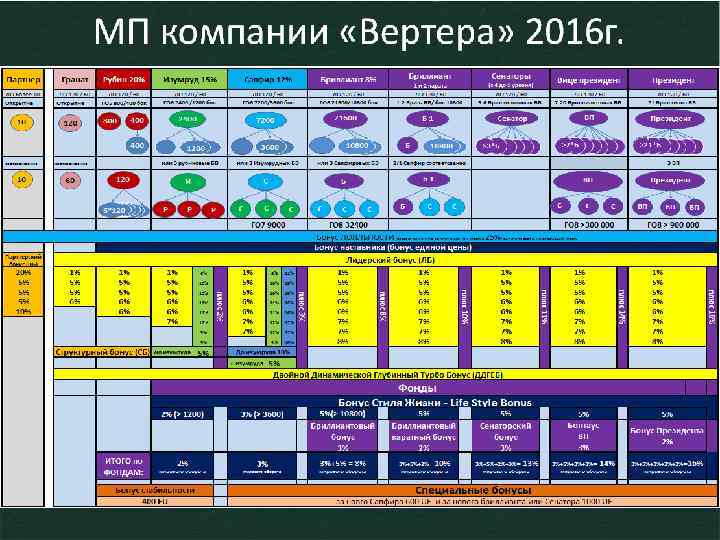 «Президент» условия закрытия – 21 бриллиантовая ветвь или 3 вице президентские с объем в ГО 8 более 900 000 б. или все ВП на 1 -м уровне Продукт Президент Бонус лояльности 120 баллов * 25% * 75 рублей = 2250 рублей 120 б 1 Деньги 20 20 бриллиантовых ветвей 1. Лидерский бонус 888 600 р. 1 -й ур. 20 парт. * 120 б * 1% * 25 р. = 600 р. 2 -й ур. 60 парт. * 800 б * 5% * 25 р. = 60 000 р. 3 -й ур. 180 парт * 800 б * 5% * 25 р. = 180 000 р 4 -й ур. 540 парт * 800 б * 6% * 25 р. = 648 000 р 2. Бонус наставника 20 парт. * 1 500 р. (БН с Торгового пакет «Гермес» ) = 30 000 р. 3. Бриллиантовый бонус переменная величина от 250 000 р. 4. Бонус LSB т. к. боковой оборот больше 10800 р переменная величина от 450 000 р. 5. Квартальный сенаторский бонус от 900 000 р. (ежемесячный средний чек 300 000 р) 6. Вице президентский бонус 3% от 1 125 000 р 7. Президентский бонус 2% от 1 500 000 р _______________ Итого : от 4 543 600 р. * при расчете использовалось следующие данные: оборот 3 000 баллов, во всей компании 3 ВП и 1 Президент, фонды бриллиантовые и сенаторские выросли пропорционально текущим. Расчет фондов произведен от денежного оборота.