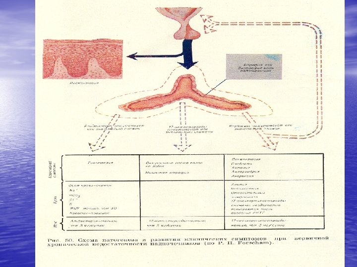 • Психическая депрессия; • Артериальная гипотония с ортостатическим коллапсом; Диспептические расстройства: • Плохой аппетит и тошнота, иногда рвота; • Периодически возникающие разлитые боли в животе, расстрой-ство стула; • Пристрастие к солёной пищи, употребление соли в чистом виде