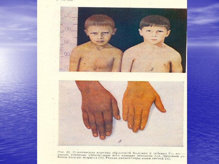 Клинические проявления 1 -НН • Гиперпигментация кожи и слизистых (имеется гиперсекреция не только АКТ но и его предшественника пропиомеланокортина которого из образуется АКТГ и меланостимулирующийгормон); • Похудание на 5 -20 кг; • Общая и мышечная слабость со снижением работоспособности. • Кистевая динамометрия показывает низкие цифры. При декомпенсации заболевания - адинамия;