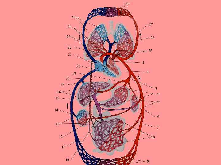 Круги кровообращения (КК) Большой круг кровообращения. (Оборот крови в нем происходит за 20 -25 секунд) органные ЛЖ→ аорта→ артерии→ МЦР органов→ органные полые вены → вены→ ПП ↑ ЛП← легочные вены ↓ ← МЦР ← легочные← легочный← ПЖ легкого артерии ствол Малый к. к. (Оборот крови в нем происходит за 4 -5 секунд)