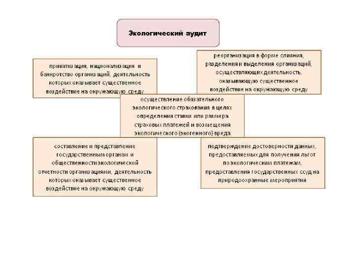 Для обоснования функционирования экологического аудита как самостоятельного и необходимого элемента рассматриваемого механизма необходимо определить его соотношение с другими элементами, такими, как оценка негативного воздействия на окружающую среду (ОВОС), экологическая экспертиза, экологическая сертификация (аудит). Одни элементы этого механизма - ОВОС и экологическая экспертиза действуют на стадии принятия решений. Их действие направлено на учет экологических требований и предотвращение негативных воздействий на окружающую среду при планируемой к осуществлению деятельности. Соблюдение экологических требований в отношении готовой продукции и процессов ее производства должно обеспечиваться посредством экологической сертификации. По различным причинам не всегда оказываются эффективными и выполняются требования указанных элементов рассматриваемого механизма при реализации проекта. В таких случаях соблюдение экологических требований в процессе принятия экологически значимых решений возможно посредством экологического аудита. Экологическая экспертиза – установление соответствия намечаемой хозяйственной и иной деятельности экологическим требованиям и определение допустимости реализации объекта экологической экспертизы в целях предупреждения возможных неблагоприятных воздействий этой деятельности на окружающую природную среду и связанных с ними социальных, экономических и иных последствий реализации объекта экологической экспертизы. Оценка воздействия на окружающую среду – процесс, способствующий принятию экологически ориентированного управленческого решения о реализации намечаемой хозяйственной и иной деятельности посредством определения возможных неблагоприятных воздействий, оценки экологических последствий, учета общественного мнения, разработки мер по уменьшению и предотвращению воздействий.