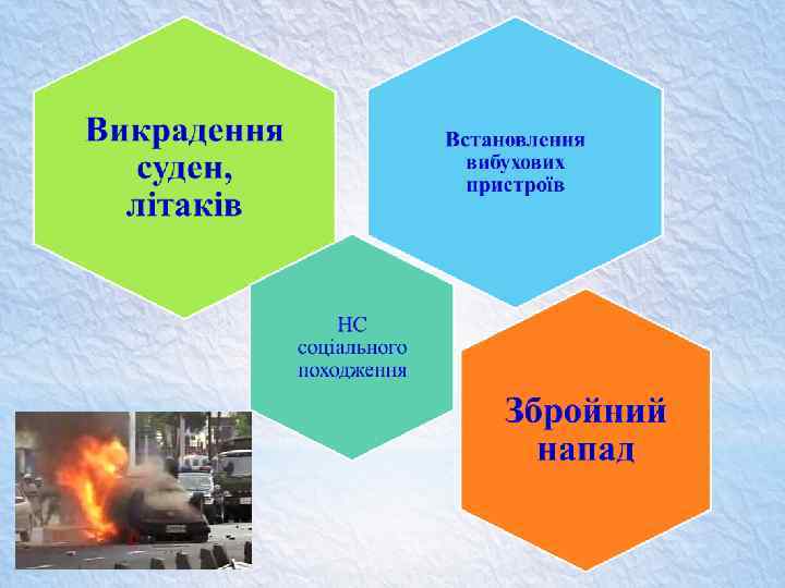 Джерела небезпеки виникнення НС техногенного характеру (продовження) üнаслідки терористичної діяльності; üгідротехнічні споруди; üнеконтрольоване ввезення в Україну, зберігання і використання техногенно небезпечних технологій, речовин, матеріалів; üнадмірне та неврегульоване накопичення побутових і промислових відходів, непридатних для використання засобів захисту рослин;