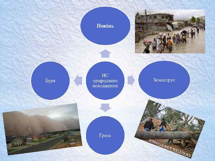 ГРОЗА - це грім і блискавка з дощем або градом. Під час грози зазвичай ще й сильний вітер. БУРЯ - вітер великої руйнівної сили, який дме тривалий час. Бурю ще називають буревієм. Великої шкоди завдає буревій людині й природі: руйнує будівлі, лінії електропередач, ламає дерева. ЗЕМЛЕТРУС – це коливання земної поверхні, що виникають унаслідок підземних поштовхів величезної сили. Землетруси здебільшого виникають у гірській місцевості. На рівнинній місцевості вони бувають рідко і невеликої сили. Під час слабкого землетрусу в будинках дзенькотить посуд, розгойдуються люстри, хитаються меблі… Під час сильних – пошкоджуються будинки: руйнуються дахи, обвалюються стелі, тріскаються стіни. ПОВІНЬ – це розлиття річки під час таяння снігу, льоду або від тривалих дощів і злив. Найчастіше повені бувають у тих селах і містах, які розміщені на берегах річок.