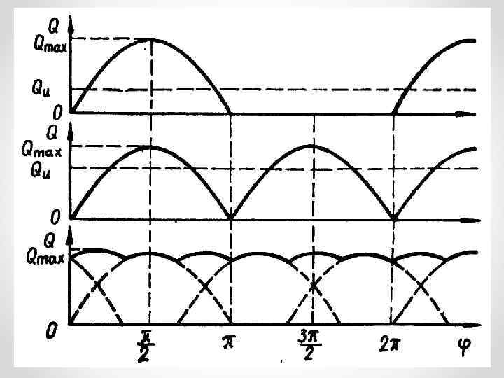 Мгновенная подача насоса является величиной переменной и изменяется по синусоидальному закону. На рисунке приведены для примеры графики подачи поршневых насосов: а) одностороннего действия; б) двухстороннего действия; в) трехпоршневого одностороннего действия со смещением фаз рабочих циклов на 120°.