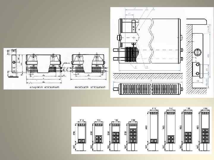 Схемы установки нагревательных приборов под окнами: а) установка нагревательного прибора относительно края окна; б) установка радиаторов; в) установка конвектора с кожухом; г) установка конвектора без кожуха