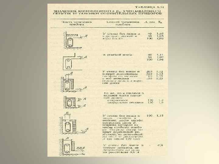 Схемы установки нагревательных приборов с различным коэффициентом укрытия β 4: а) β 4 = 1, 2; б) β 4 = 1, 05; в) β 4 = 1, 05; г) β 4 = 0, 9; д) β 4 = 1, 25