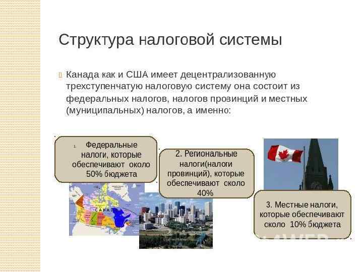 Корпоративное налогообложение в Канаде Система подоходного налогообложения Канады функционирует по принципу резидентности, а не гражданства. Таким образом, существует 4 класса налогоплательщиков: лица с постоянным местом жительства, лица с временным местом жительства, лица, считающиеся резидентами и нерезиденты. Общий объем налога составляет от 18, 5% до 48, 7% в зависимости от провинции, вида прибыли и формы собственности. В целом, все расходы на получение прибыли подлежат вычету из налогооблагаемой прибыли в Канаде.