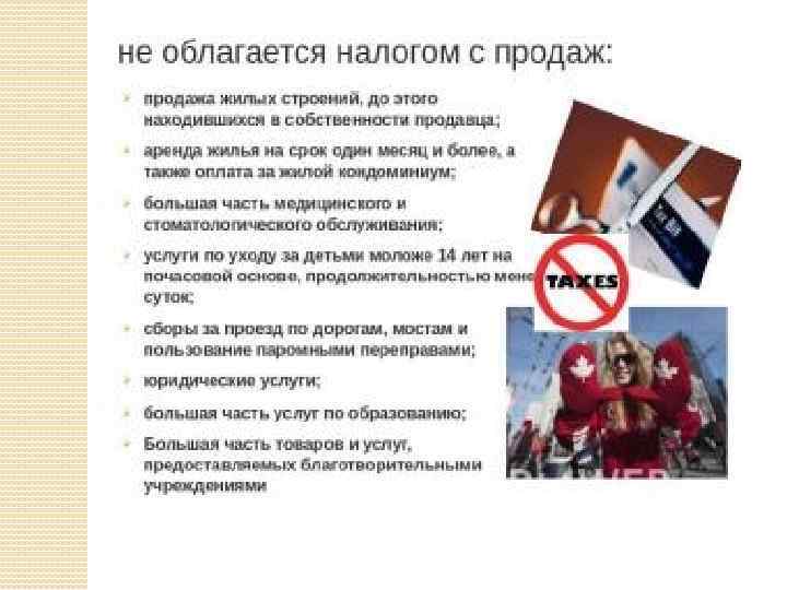 Помимо налога на доход, субъектам малого бизнеса необходимо платить FST (Federal Sales Tax) и. PST (Provincial Sale Tax), в том случае, если величина продаж товаров и (или) предоставляемых вами услуг превышает $30. 000 в год. Размер Federal Sales Tax одинаковый для всей страны и составляет 6%. Оплачивать его следует на счета Revenue Canada. А вот размер Provincial Sale Tax у каждой провинции свой и сумму налога перечисляют в министерство финансов конкретной провинции. Поскольку эти налоги заложены в стоимость товаров и услуг, то фактически их оплачивает покупатель или клиент, а продавец лишь передает сумму налога государству. Вот почему цены на одинаковые товары и услуги в разных провинциях разные: если в Онтарио PST составляет 8%, то в Альберте этот налог вообще отменен. Должен заметить, что некоторые услуги и товары не облагаются налогами FST и PST, это лекарства, товары для детей, инвалидов и т. д.
