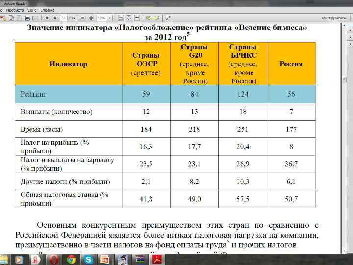 Рейтинг «Ведение деятельности» Индикатор «Налогообложение» Российская Федерация в отчете Doing Business 2014, который оценивает условия ведения деятельности по итогам 2012 года, поднялась за год в списке с 112 до 92 позиции, в том числе по индикатору «Налогообложение» со 130 на 56 место. В 2018 году – 20 место планируется в целом и 50 по индикатору «Налогообложение» Индикатор «Налогообложение» предоставляет информацию о налогах, которые должна уплатить в определенном году компания среднего размера, а также сопоставляет административную нагрузку, связанную с уплатой налогов.