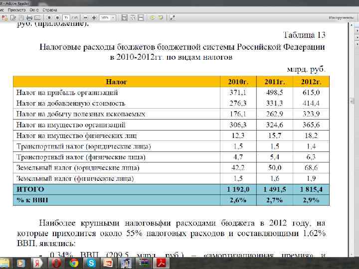 Причины: Наиболее крупными налоговыми расходами бюджета в 2012 году, на которые приходится около 55% налоговых расходов и составляющими 1, 62% ВВП, являлись: - 0, 34% ВВП (209, 5 млрд. руб. ) – «амортизационная премия» и повышенные коэффициенты амортизации по налогу на прибыль организаций; - 0, 30% ВВП (186, 5 млрд. руб. ) – льготы по налогу на имущество организаций по инфраструктурным объектам (магистральные трубопроводы, линии энергопередачи, железнодорожные пути, а также сооружения, являющиеся неотъемлемой частью указанных объектов); - 0, 25% ВВП (156, 0 млрд. руб. ) – применение при расчете налога на добычу полезных ископаемых понижающих коэффициентов; - 0, 22% (134, 4 млрд. руб. ) – убытки прошлых лет, уменьшающие налоговую базу текущего налогового периода; - 0, 22% (133, 4 млрд. руб. ) – региональные льготы и пониженные ставки по налогу на имущество организаций; - 0, 13% (83, 1 млрд. руб. ) – обложение налогом на прибыль организаций по ставке 0% дивидендов, распределенных российским организациям; - 0, 10% (63, 1 млрд. руб. ) – пониженные ставки по налогу на прибыль организаций, установленные законами субъектов Российской Федерации. - 0, 06% (38, 3 млрд. руб. ) – 0% ставка по налогу на прибыль организаций для сельскохозяйственных товаропроизводителей, организаций, осуществляющих медицинскую и образовательную деятельность.