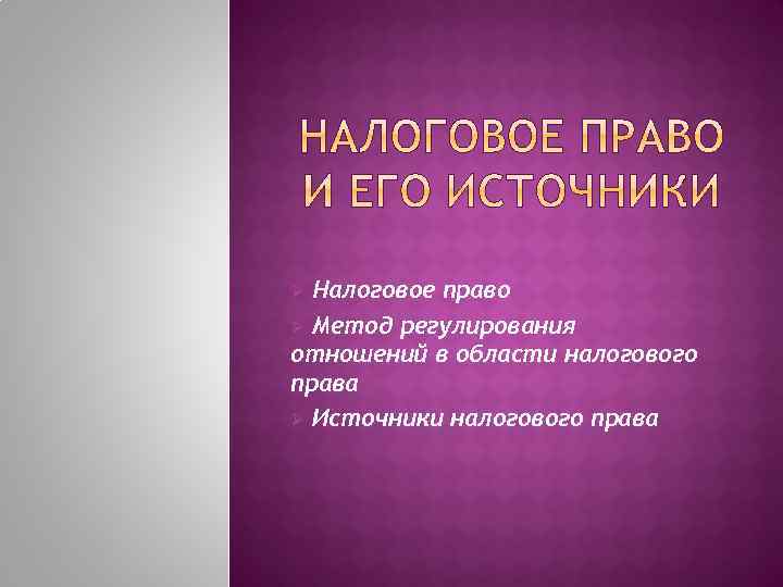 Налоговое право Ø Метод регулирования отношений в области налогового права Ø Источники налогового права Ø