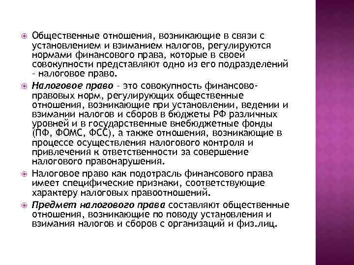 Общественные отношения, возникающие в связи с установлением и взиманием налогов, регулируются нормами финансового права, которые в своей совокупности представляют одно из его подразделений – налоговое право. Налоговое право – это совокупность финансовоправовых норм, регулирующих общественные отношения, возникающие при установлении, ведении и взимании налогов и сборов в бюджеты РФ различных уровней и в государственные внебюджетные фонды (ПФ, ФОМС, ФСС), а также отношения, возникающие в процессе осуществления налогового контроля и привлечения к ответственности за совершение налогового правонарушения. Налоговое право как подотрасль финансового права имеет специфические признаки, соответствующие характеру налоговых правоотношений. Предмет налогового права составляют общественные отношения, возникающие по поводу установления и взимания налогов и сборов с организаций и физ. лиц.