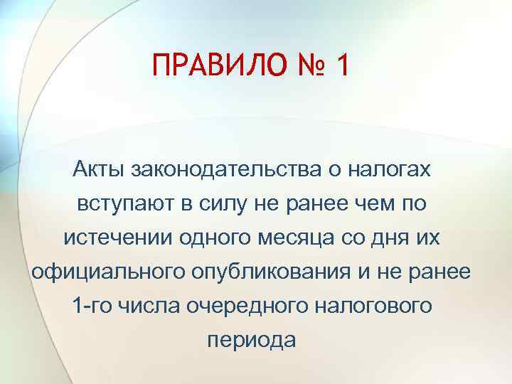 ПРАВИЛО № 1 Акты законодательства о налогах вступают в силу не ранее чем по истечении одного месяца со дня их официального опубликования и не ранее 1 -го числа очередного налогового периода