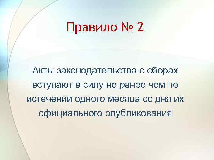 Правило № 2 Акты законодательства о сборах вступают в силу не ранее чем по истечении одного месяца со дня их официального опубликования