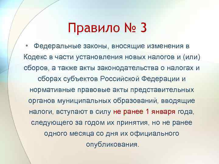 Правило № 3 • Федеральные законы, вносящие изменения в Кодекс в части установления новых налогов и (или) сборов, а также акты законодательства о налогах и сборах субъектов Российской Федерации и нормативные правовые акты представительных органов муниципальных образований, вводящие налоги, вступают в силу не ранее 1 января года, следующего за годом их принятия, но не ранее одного месяца со дня их официального опубликования.
