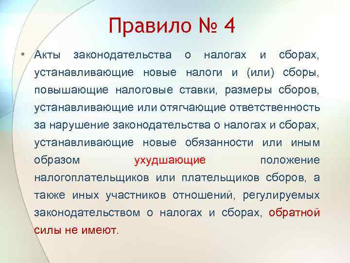 Правило № 4 • Акты законодательства о налогах и сборах, устанавливающие новые налоги и (или) сборы, повышающие налоговые ставки, размеры сборов, устанавливающие или отягчающие ответственность за нарушение законодательства о налогах и сборах, устанавливающие новые обязанности или иным образом ухудшающие положение налогоплательщиков или плательщиков сборов, а также иных участников отношений, регулируемых законодательством о налогах и сборах, обратной силы не имеют.