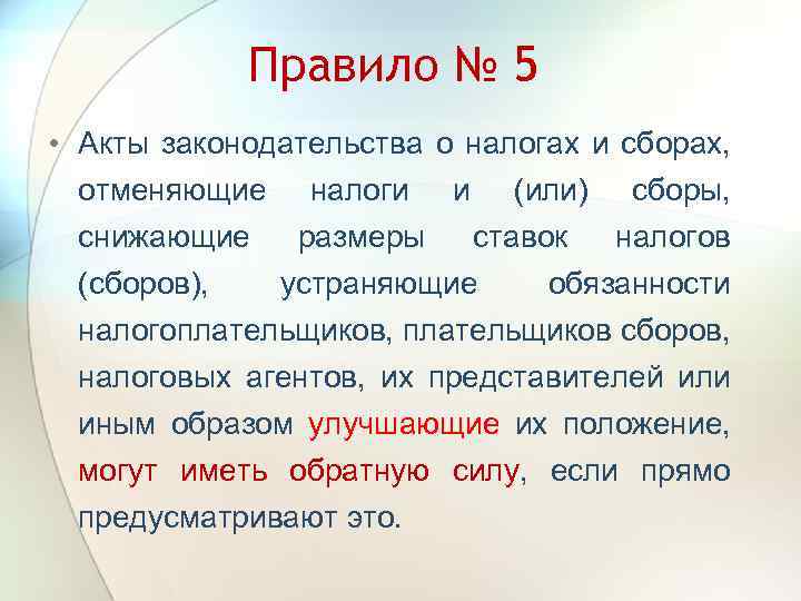 Правило № 5 • Акты законодательства о налогах и сборах, отменяющие налоги и (или) сборы, снижающие размеры ставок налогов (сборов), устраняющие обязанности налогоплательщиков, плательщиков сборов, налоговых агентов, их представителей или иным образом улучшающие их положение, могут иметь обратную силу, если прямо предусматривают это.